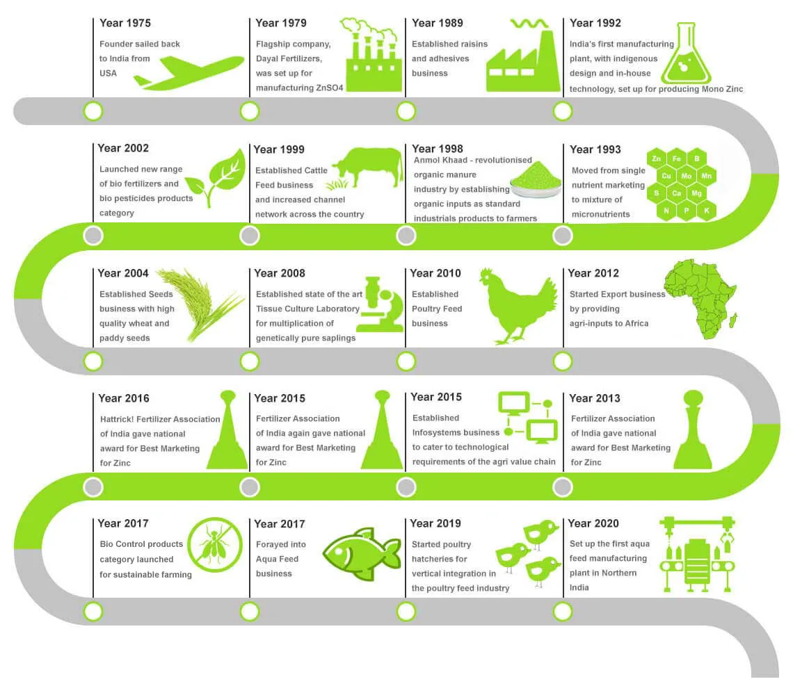 Dayal Group was established in 1979 when our flagship company, Dayal Fertilizers pioneered manufacturing of Agriculture Grade Zinc Sulphate. Today, the Group has over 6 different verticals spanning agri-inputs and services for crops and for animals.